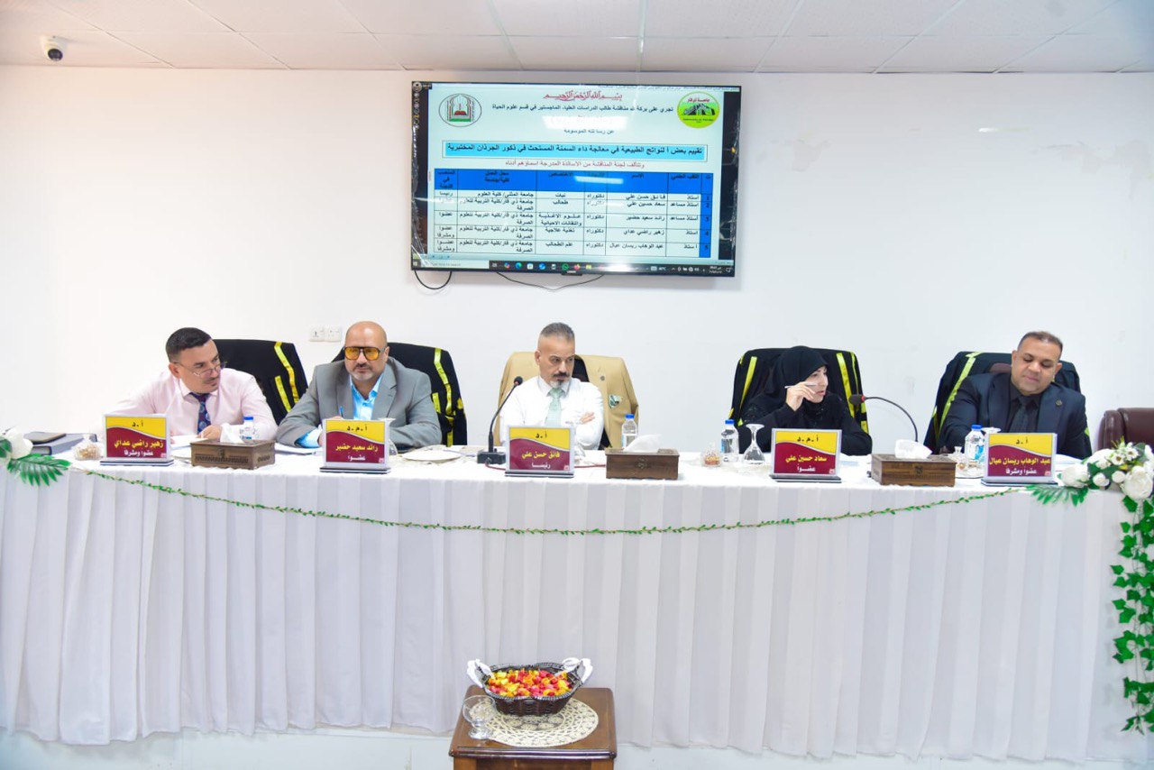 نوقشت رسالة ماجستير في كلية التربية لقسم علوم الحياة بعنوان ( تقييم بعض النواتج الطبيعية في معالجة داء السمنة المستحث في ذكور الجرذان المختبرية ) للباحث سلام كاظم زويد